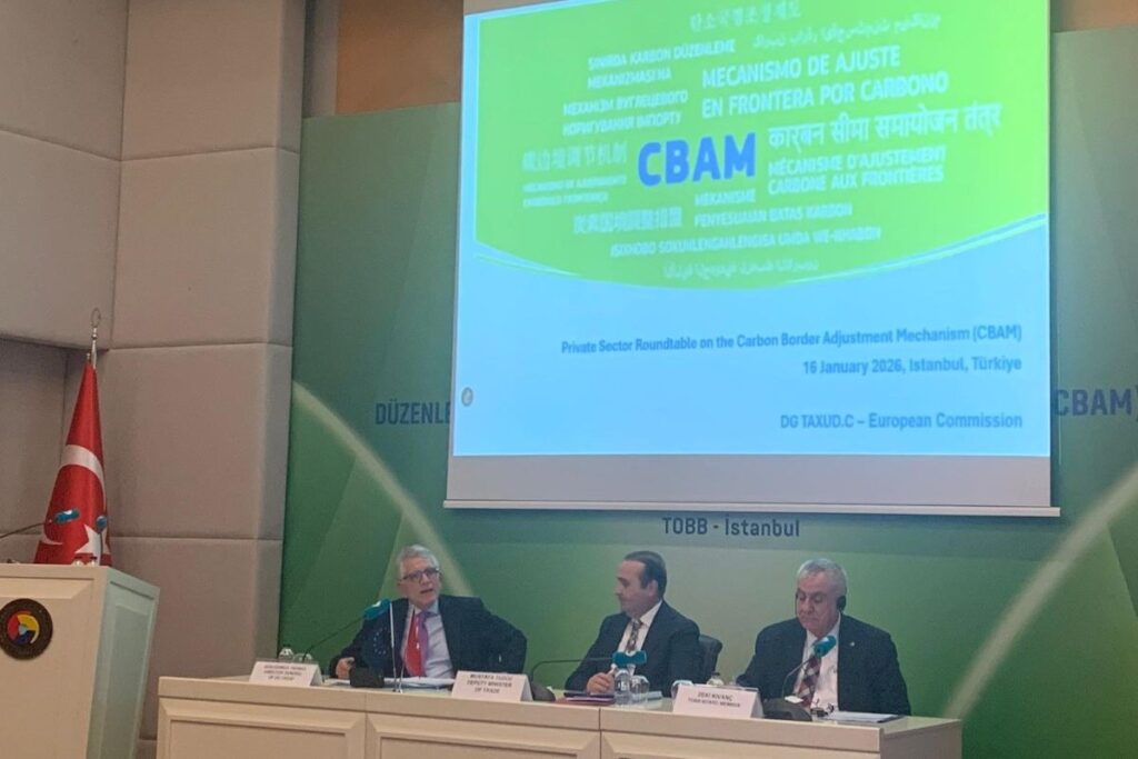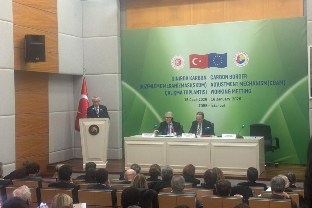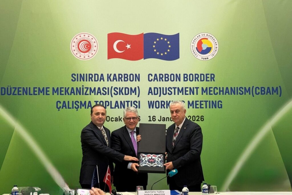Sınırda Karbon Düzenleme Mekanizması (SKDM) Çalışma Toplantısı, Türkiye Odalar ve Borsalar Birliği (TOBB) ev sahipliğinde; Ticaret Bakan Yardımcısı Mustafa Tuzcu ve AB Komisyonu Gümrükleme ve Genel Müdürlüğü DG TAXUD Direktörü Gerassimos Thomas’ın katılımı ile TOBB İstanbul Hizmet Binası’nda gerçekleştirildi.