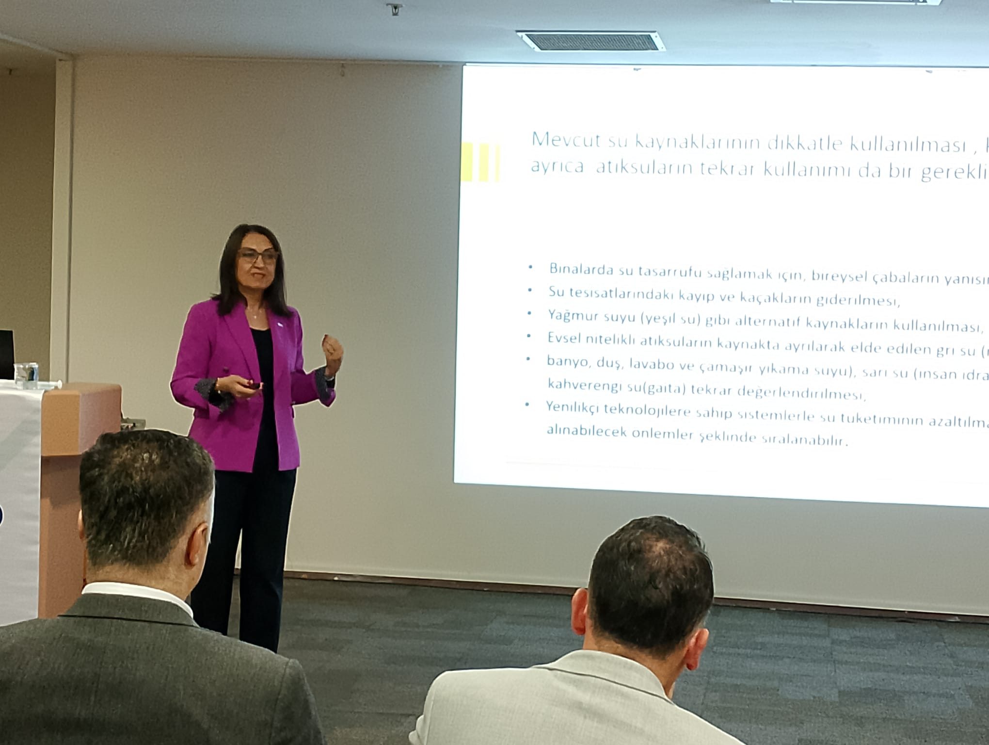 Su krizinin nedenleri, iklim krizi ve kuraklık, dünya su rezervinin dağılımı gibi başlıklara değinerek sunumuna başlayan Melek Yıldız, her alanda artan su talepleri doğrultusunda mevcut su kaynaklarının korunması ve atıksuların tekrar kullanımının bir gereklilik olduğunu söyleyerek binalarda su tasarrufu sağlamak için bireysel çabaların yanı sıra alınabilecek önlemleri sıraladı.